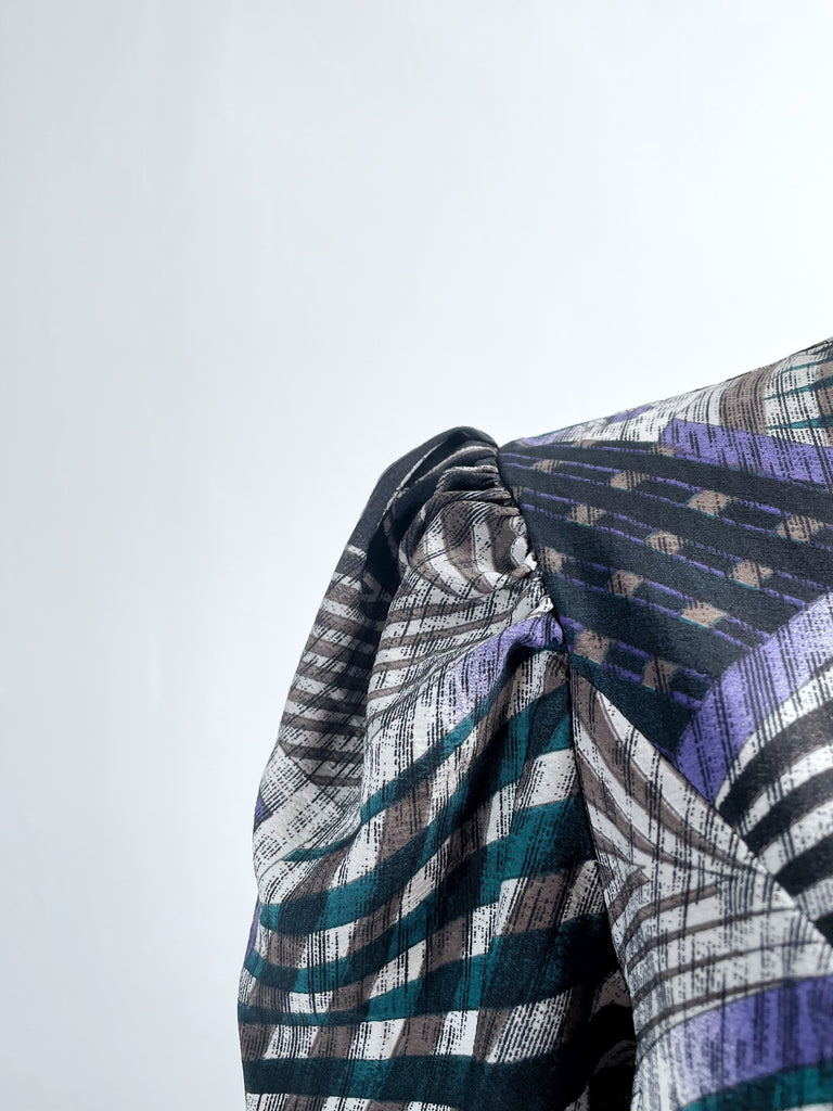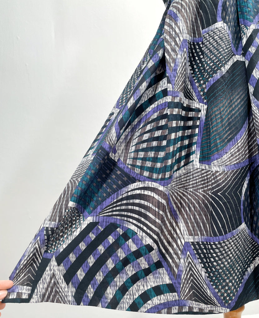 Noelle | Vintage 1970s geometric swirl print dress with matching fabric buttons