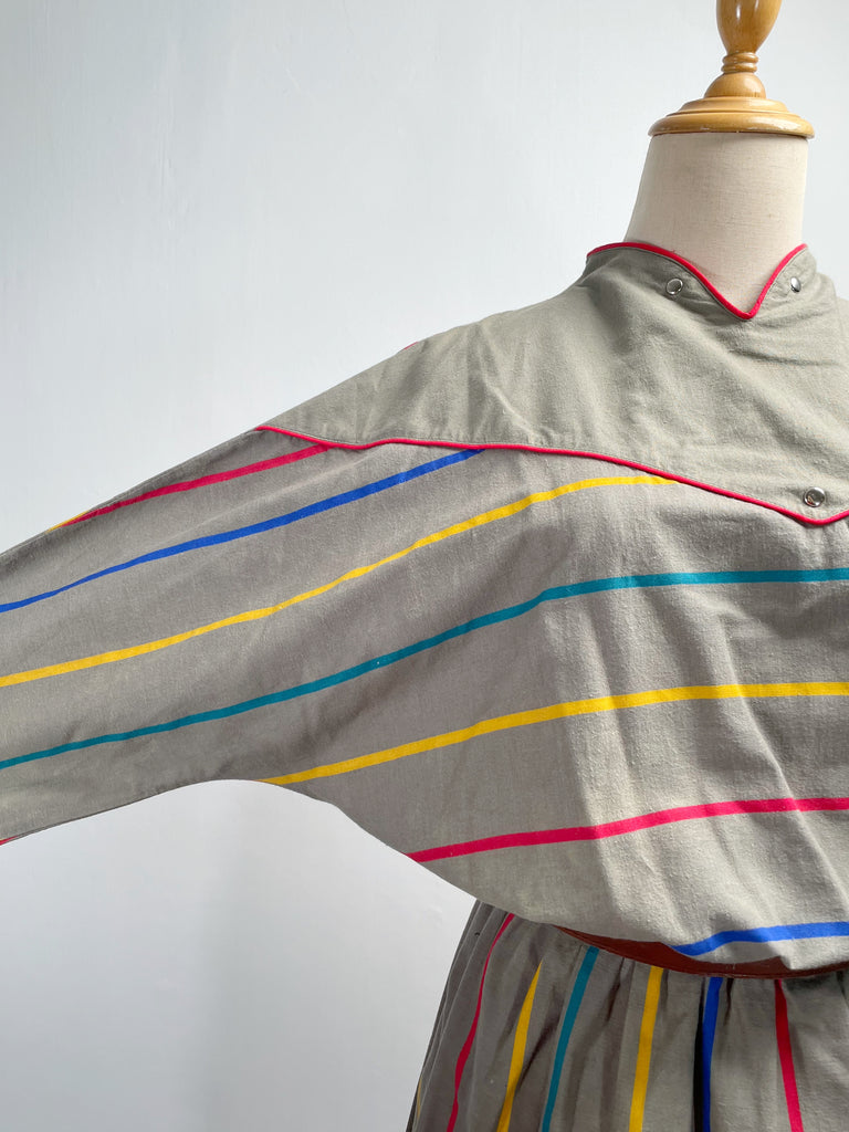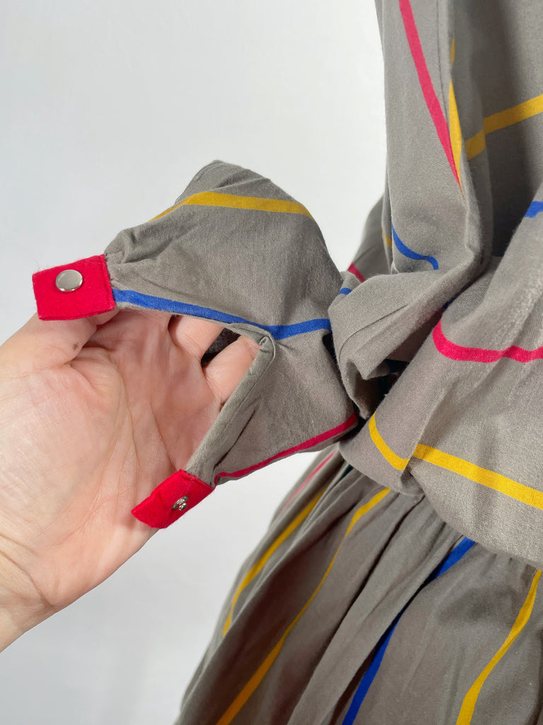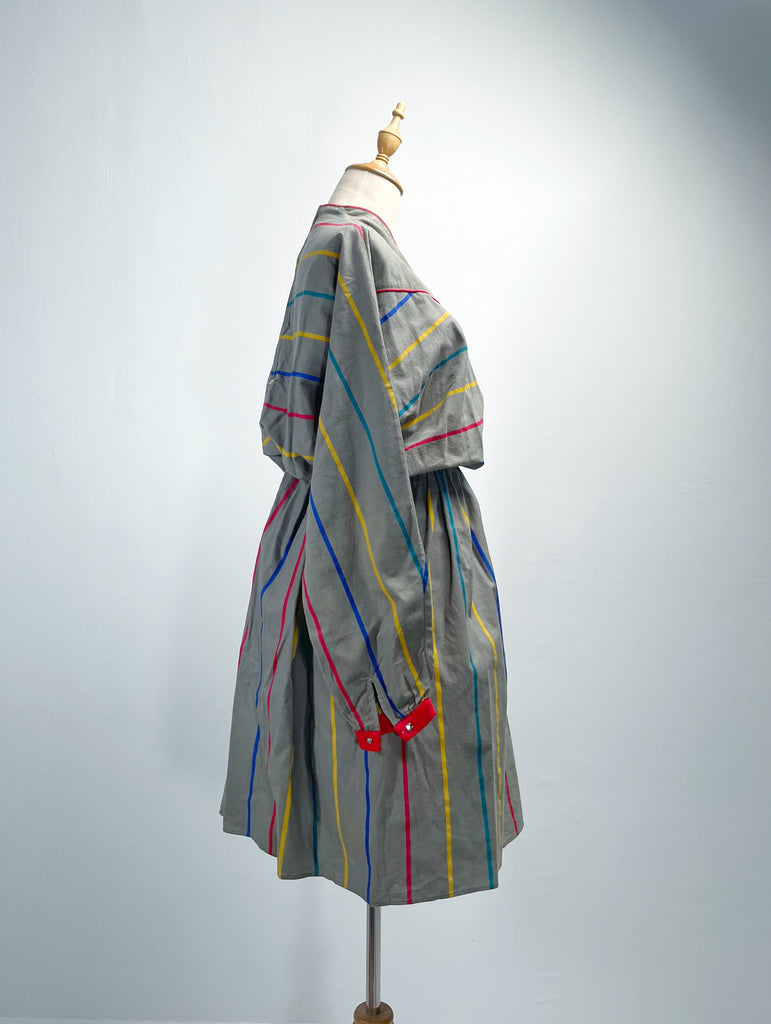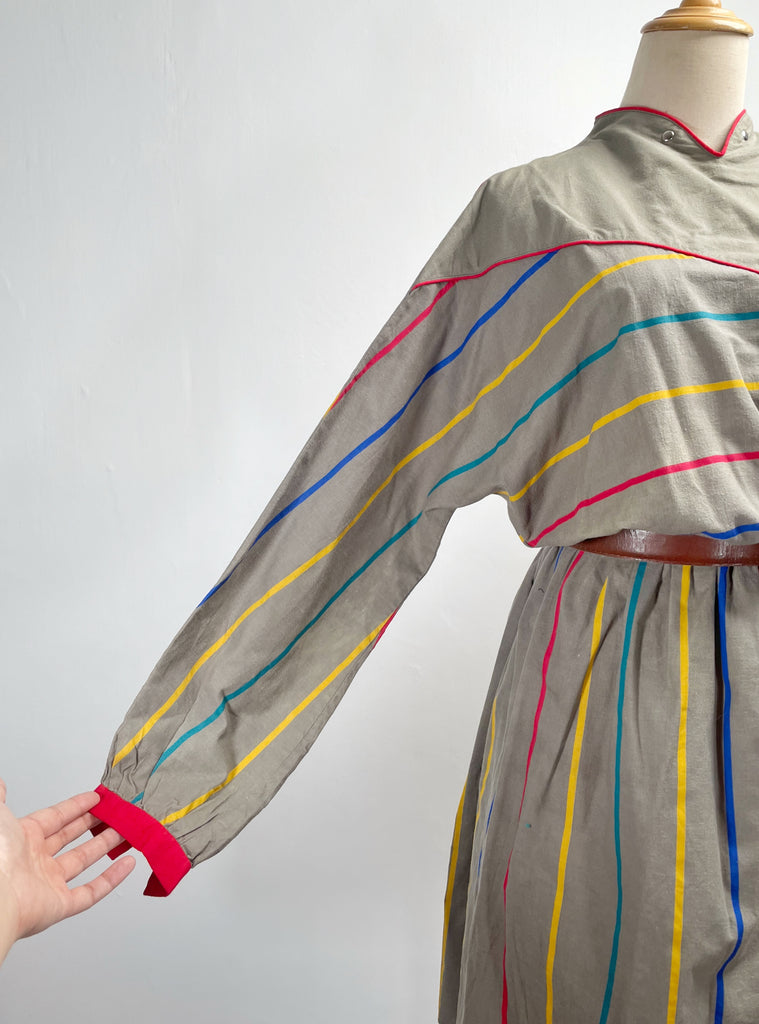 Zian | Vintage 1980s red-trimmed mini swan-collar multi-colored stripes cotton dress